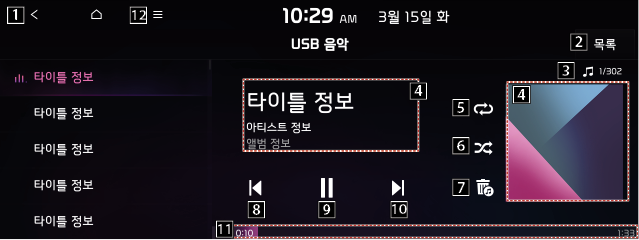 11재생 중인 곡의 총 시간과 현재 재생 위치를 확인할 수 있습니다.